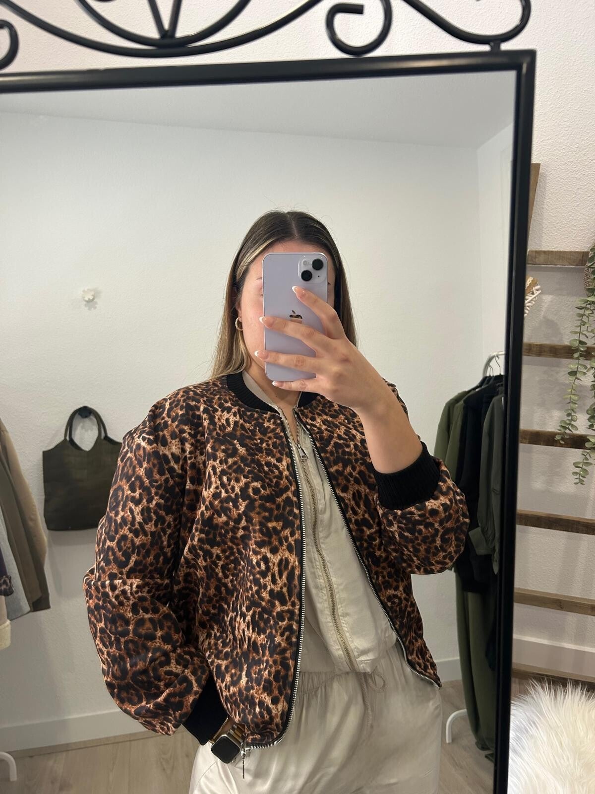 Chaqueta estilo bomber estampado leopardo.