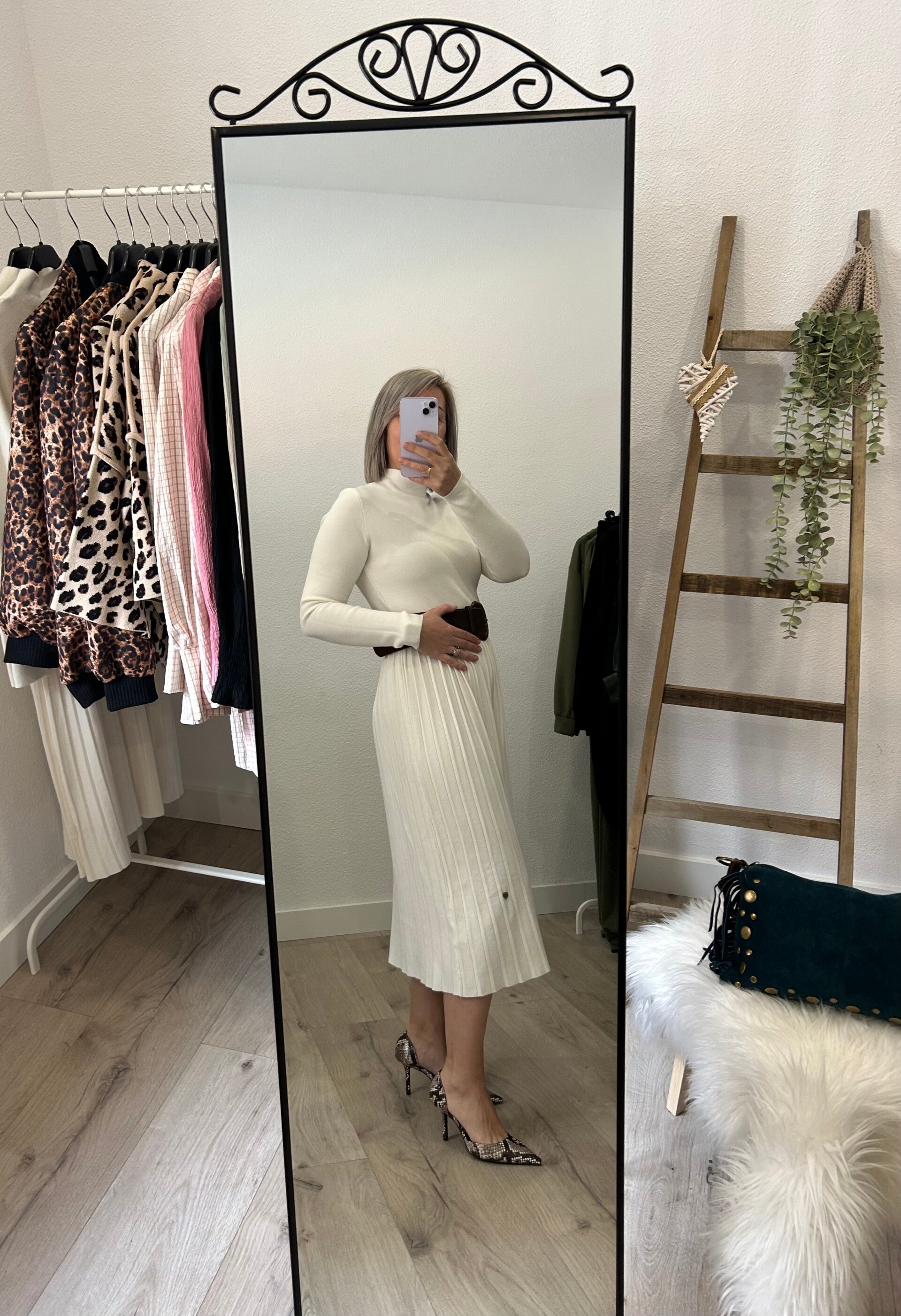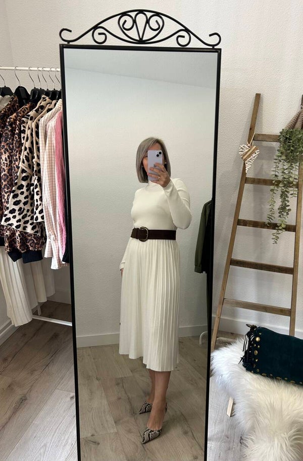 Vestido color blanco, de punto, con manga larga y cuello subido. Largo midi. Cinturón no incluido.