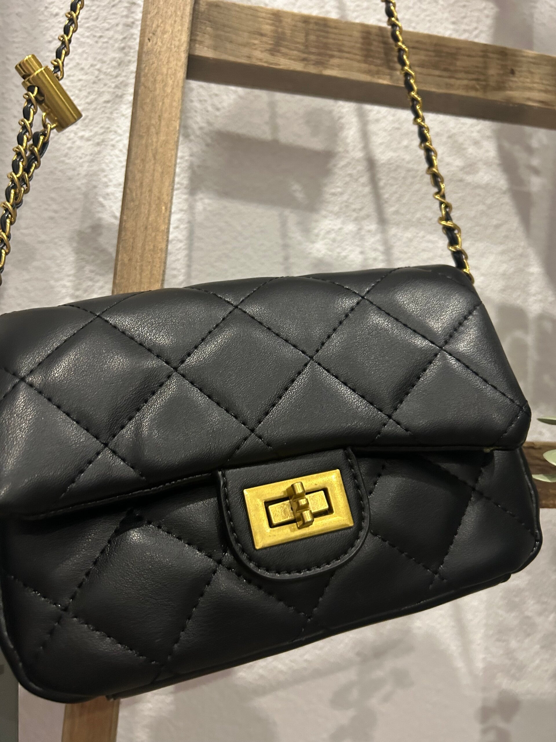 Bolso estilo bandolera, color negro, efecto acolchado con cierre y cadera en dorado. Cadena regulable.