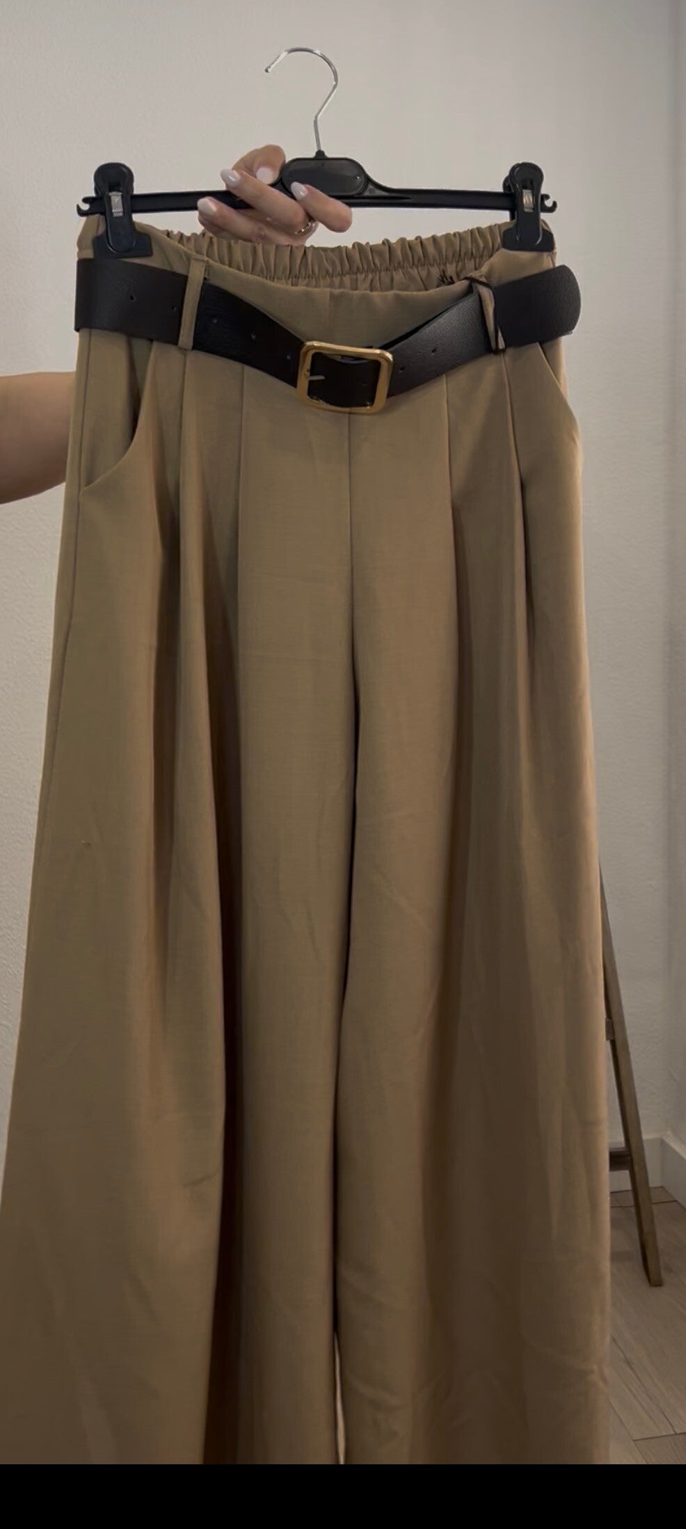 Pantalón de tiro alto con pierna ancha y cinturón incluido.