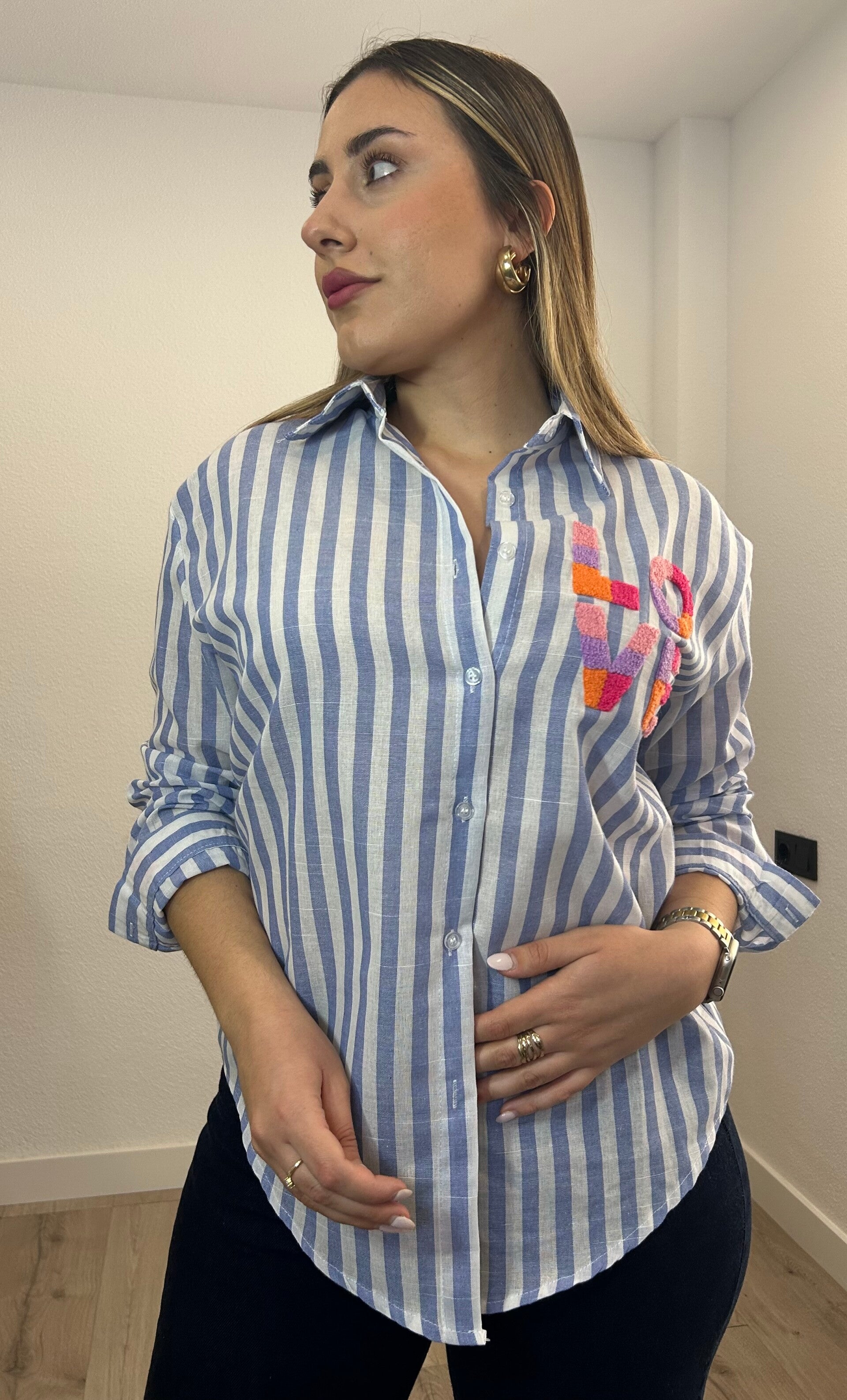 Camisa tejido efecto lino, con rayas en blanco y azul y letras en rosa bordadas tanto por delante como por detrás.
